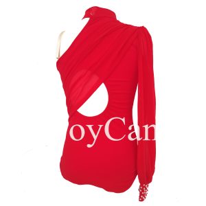 The vibrant red hue of the dress exudes confidence and passion, setting the stage for a powerful and emotive performance. The long sleeves add an element of grace and fluidity, allowing dancers to create beautiful lines and movements with their arms. The asymmetrical design, with long sleeves on one side, adds an unexpected and dynamic touch, drawing the eye and adding visual interest to the overall look.