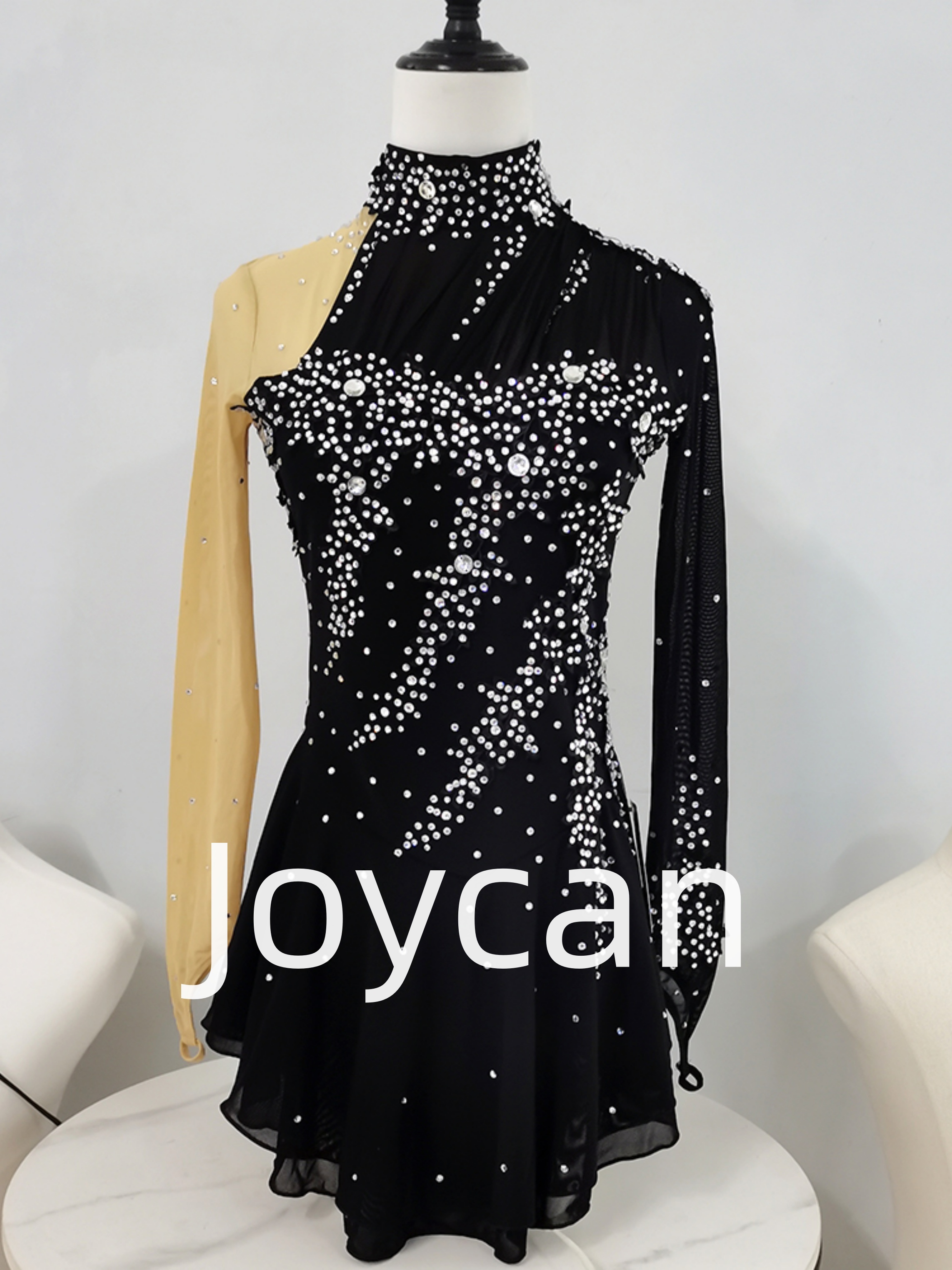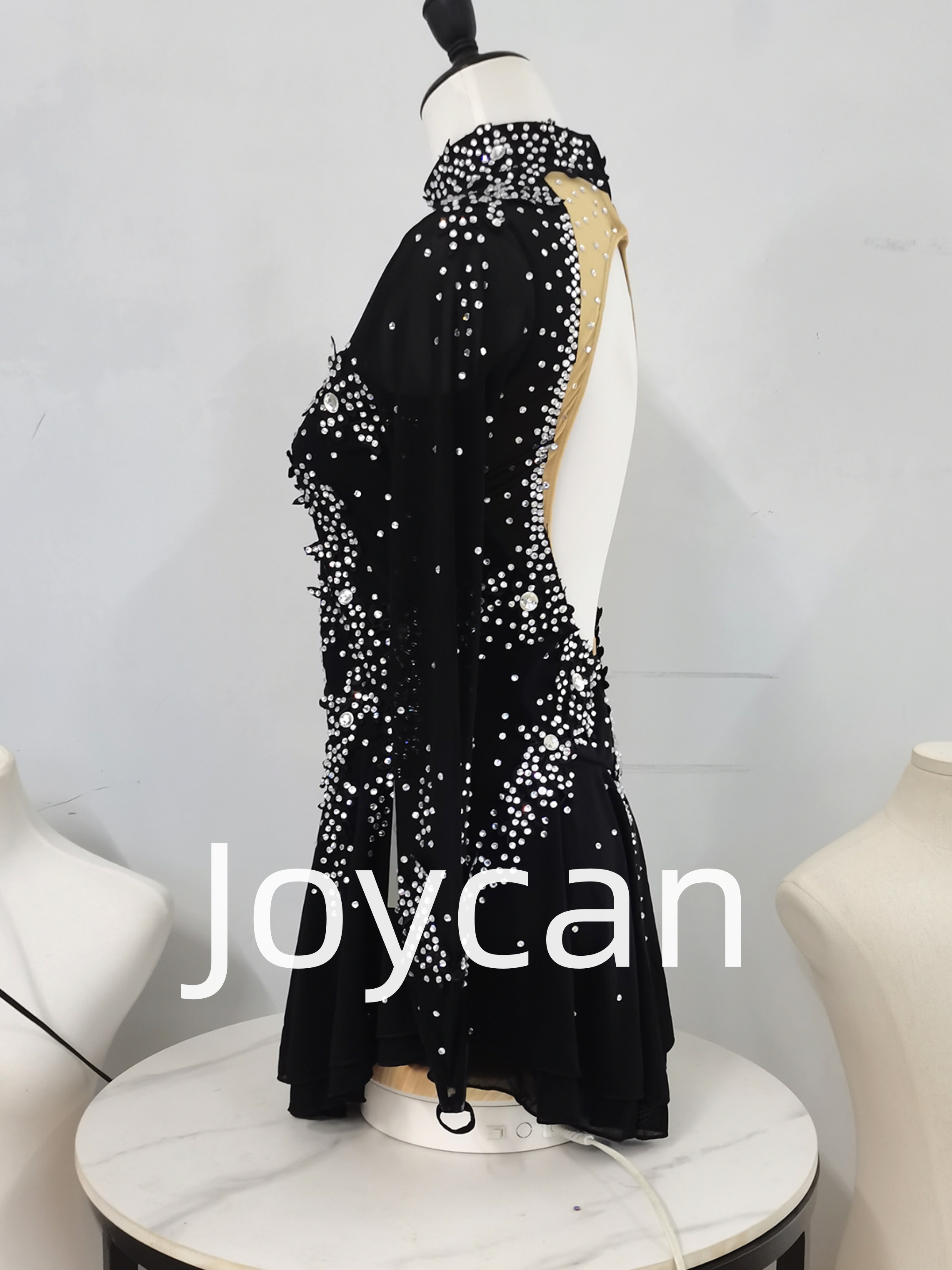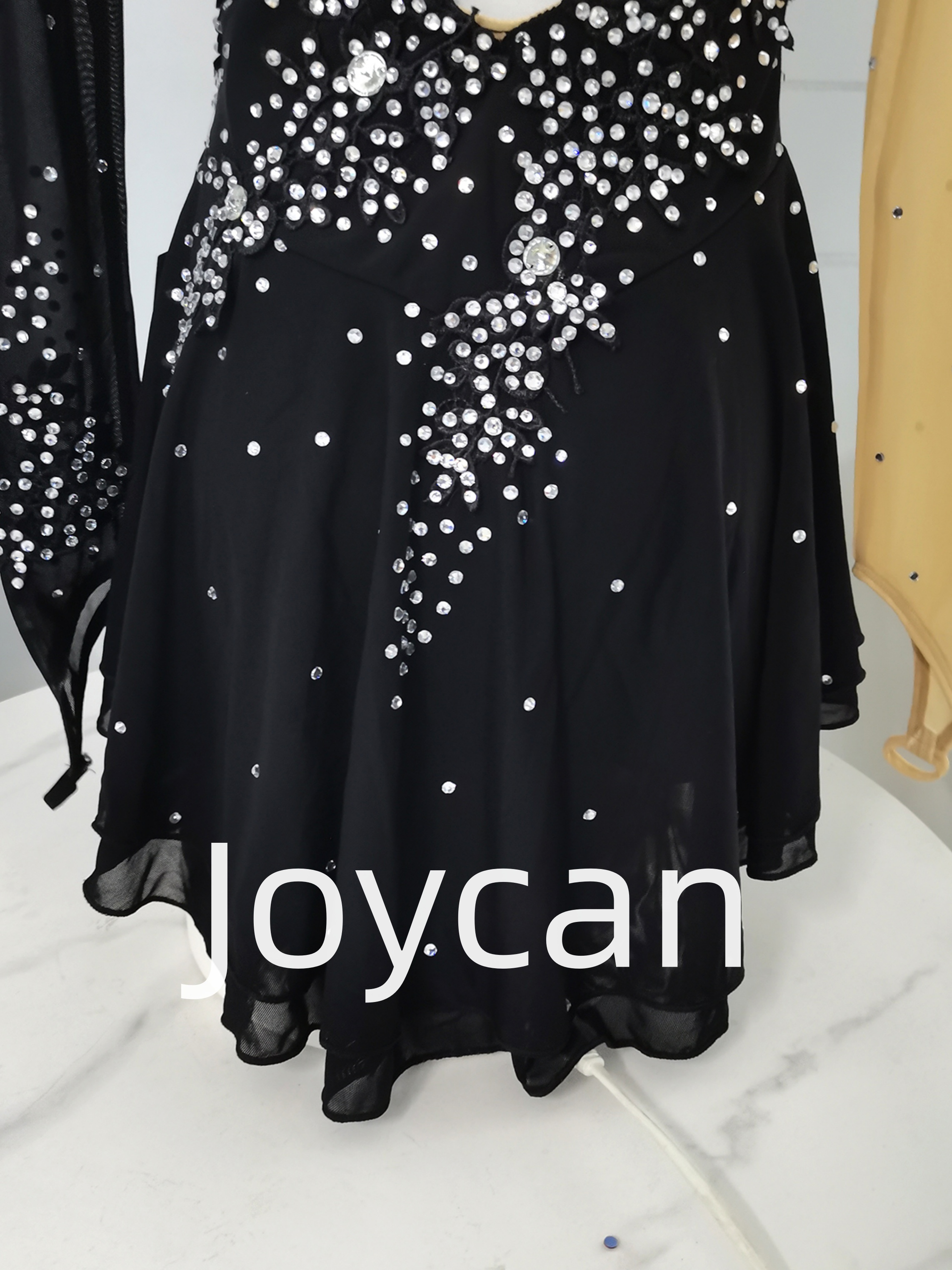 The gorgeous black fabric provides a timeless backdrop, while the dazzling diamond embellishments add a touch of sparkle, catching the light with every spin and jump. Not only are these carefully placed diamonds visually striking, they also symbolize the strength and talent of the skater who wears it. Whether you’re performing in front of a crowd or practicing your routine, this dress ensures you’ll shine, both literally and figuratively.