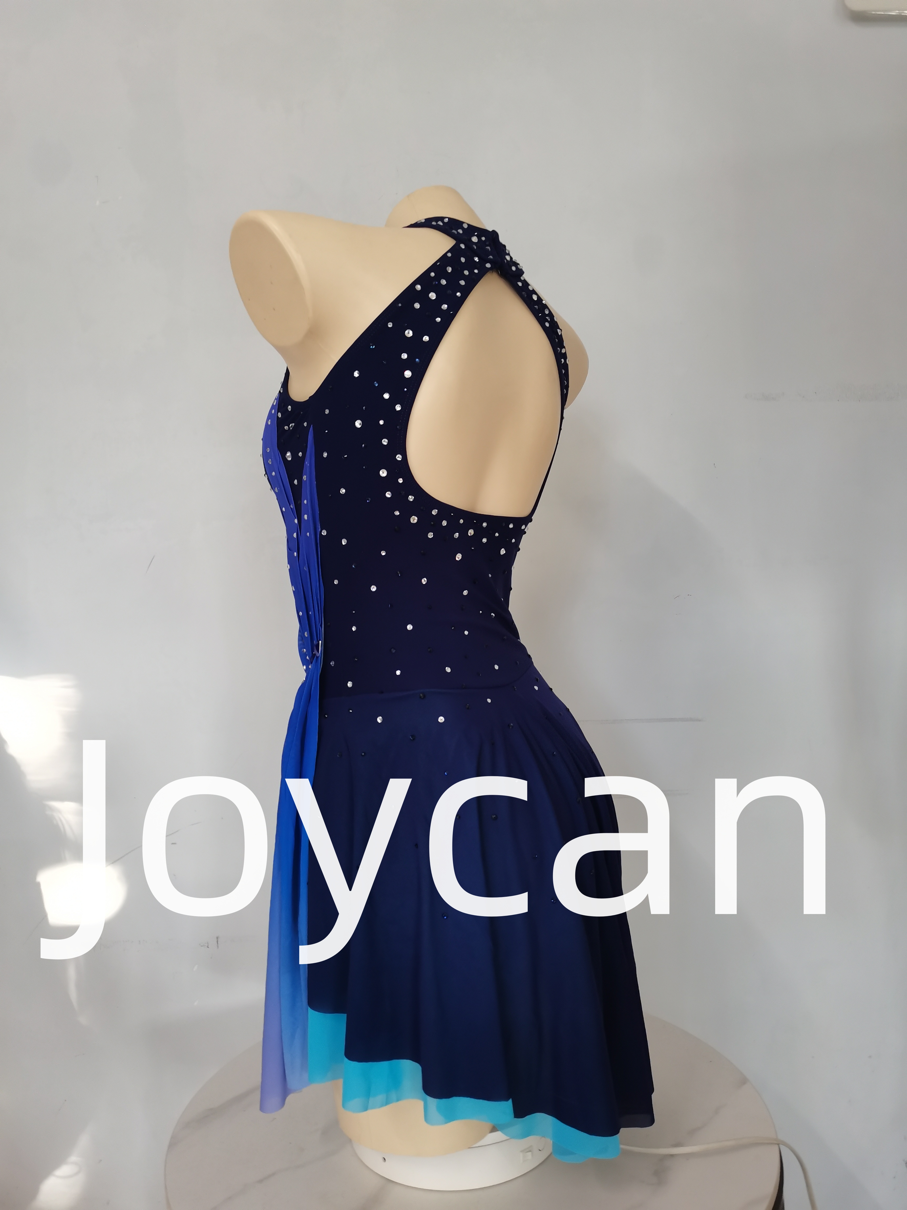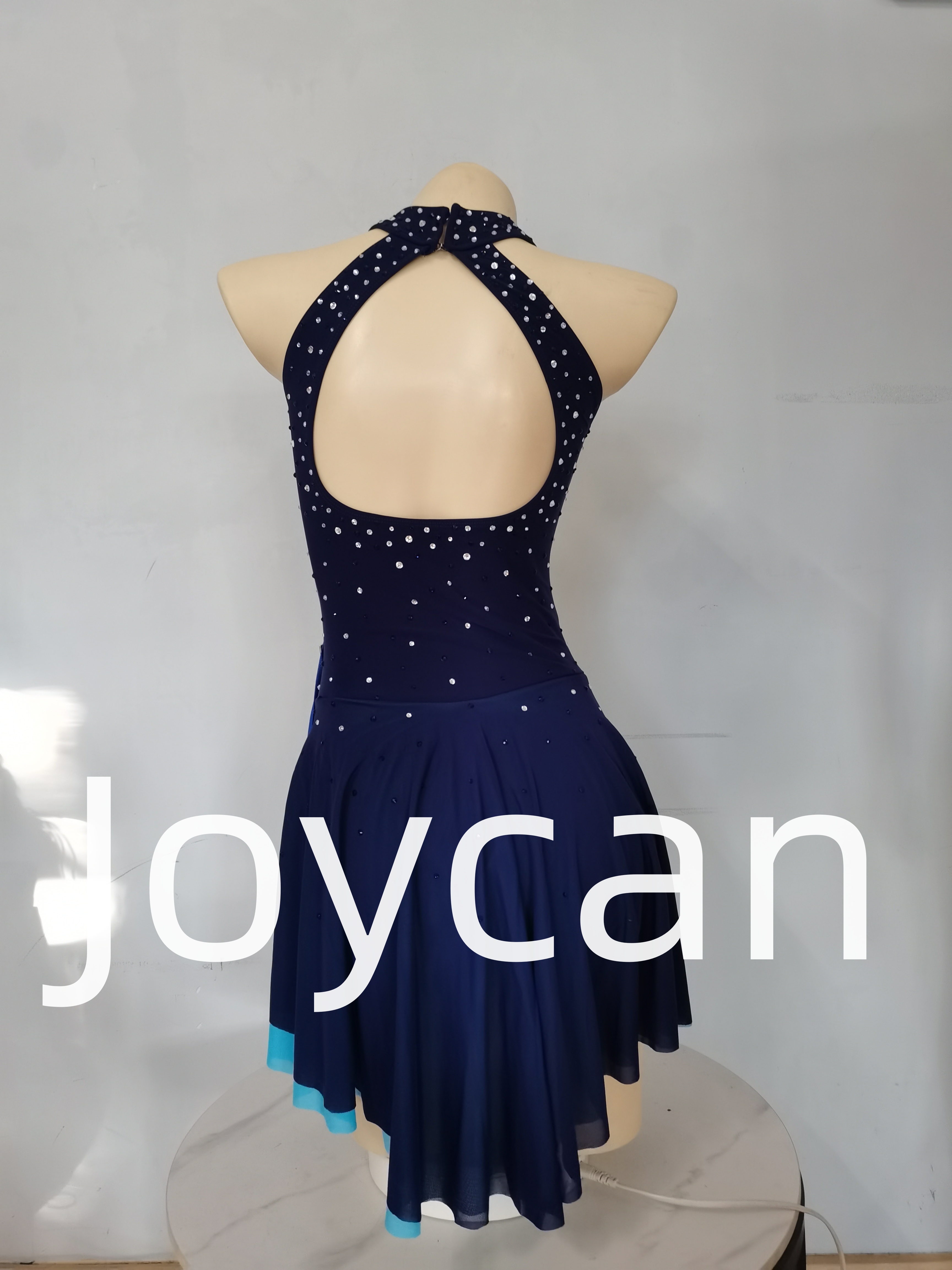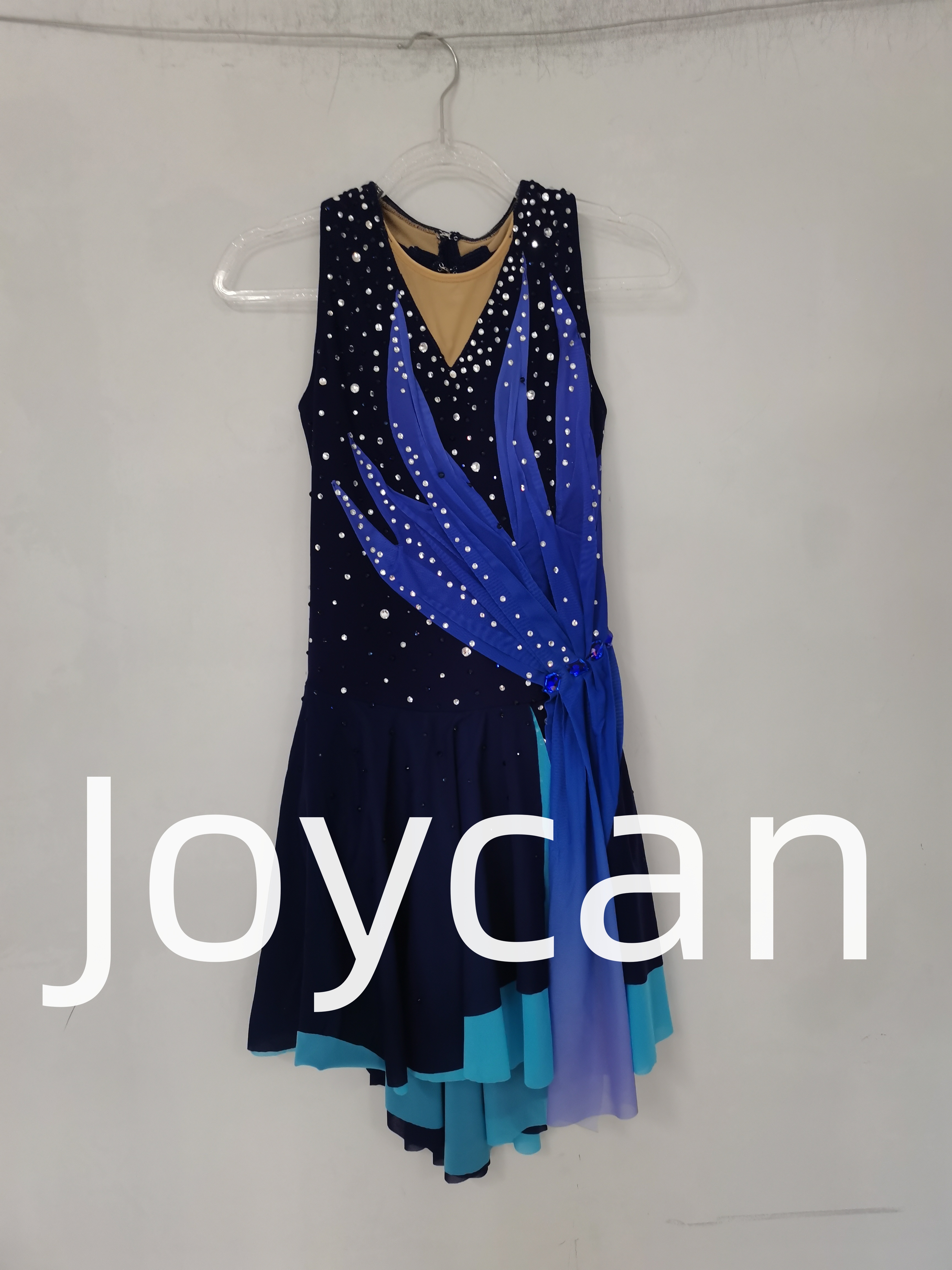The base color of the dress is a deep, rich navy blue. Navy blue, often associated with sophistication and depth, provides a classic and timeless look. It not only flatters a wide range of skin tones but also creates a sense of stability and poise as the skater glides across the ice. This color serves as a perfect canvas for the additional design elements.