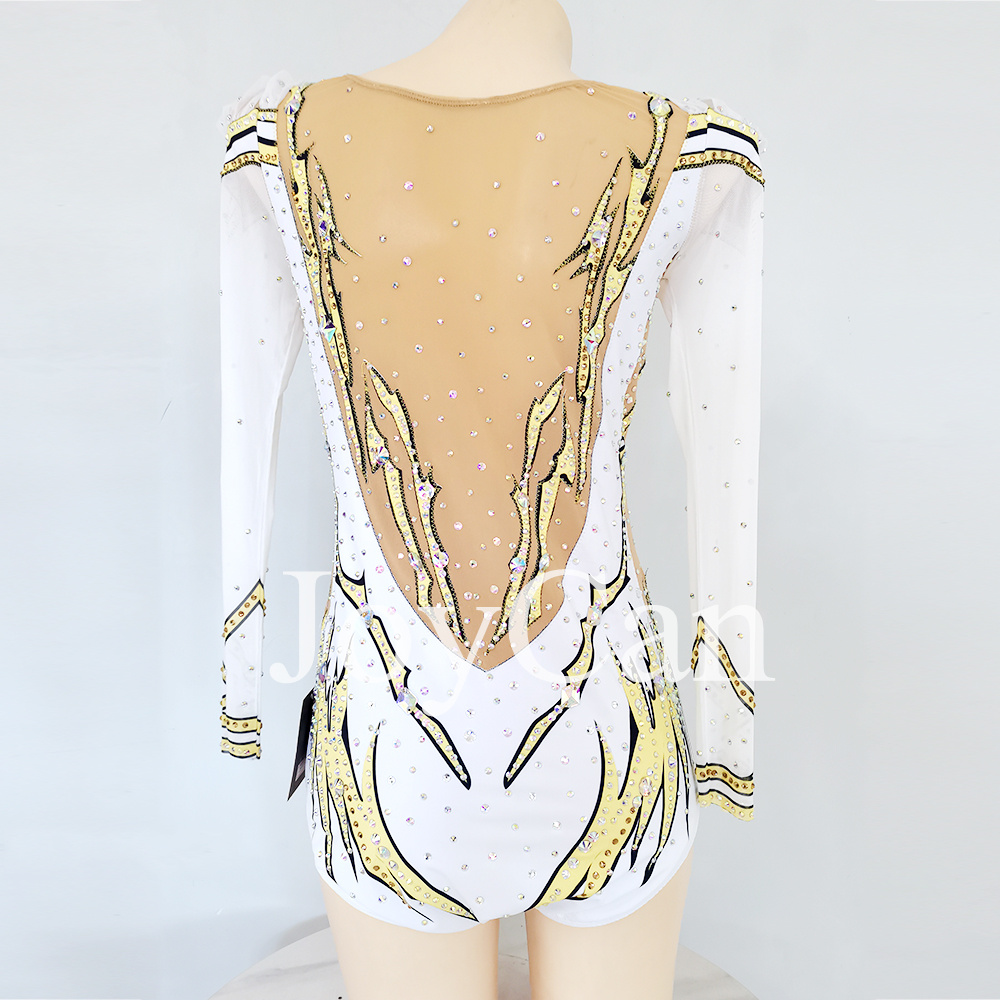 Introducing our stunning Rhythmic Gymnastics leotard, designed to elevate your performance and make you stand out on the floor. This elegant leotard features a classic white color with long sleeves, adorned with a mesmerizing golden pattern that exudes grace and sophistication. Crafted with the highest quality materials, this leotard offers a perfect blend of style, comfort, and functionality. The long sleeves provide coverage and support, allowing you to move with confidence and grace during your routines. The soft and stretchy fabric ensures a comfortable fit, allowing you to focus on your performance without any distractions. The golden pattern on the leotard adds a touch of glamour and elegance, catching the light as you move and enhancing your every movement. Whether you're performing intricate dance steps or executing complex gymnastics maneuvers, this leotard will accentuate your every motion, making your performance truly captivating. Designed for both practice sessions and competitions, this leotard is a versatile and essential addition to any gymnast's wardrobe. Its timeless white color and golden pattern make it a perfect choice for any routine, allowing you to express your individual style while maintaining a polished and professional look. Whether you're a seasoned gymnast or just starting out, this Rhythmic Gymnastics leotard is sure to become your go-to choice for training and performances. Its exquisite design and superior quality make it a standout piece that will help you shine in the spotlight. Make a statement with your performance and leave a lasting impression with our Rhythmic Gymnastics leotard. Elevate your routines with style, grace, and confidence, and experience the difference that a high-quality leotard can make in your gymnastics journey.