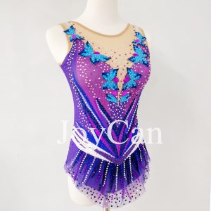 In conclusion, elevate your gymnastics experience with our purple rhythmic gymnastics leotard featuring a beautiful blue butterfly pattern, sparkling rhinestones, and a stylish mesh skirt. Embrace your inner champion and let your performance shine!Rhythmic Gymnastics JRG177